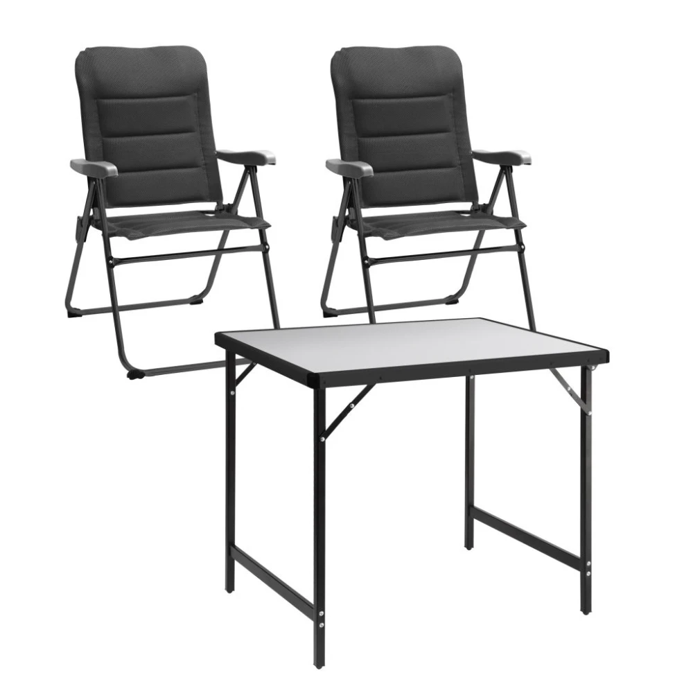 Das Compact Stuhl-/Tischset ist speziell für Camper ausgelegt, die nicht so viel Platz in ihrem Freizeitfahrzeug haben. Die zwei Klappstühle und der Campingtisch sind praktisch in einer Tasche verpackt. Schließlich will man ja nicht auf wichtiges Equipment verzichten. Hier isst man nicht nur, sondern sitzt auch gemütlich zusammen.