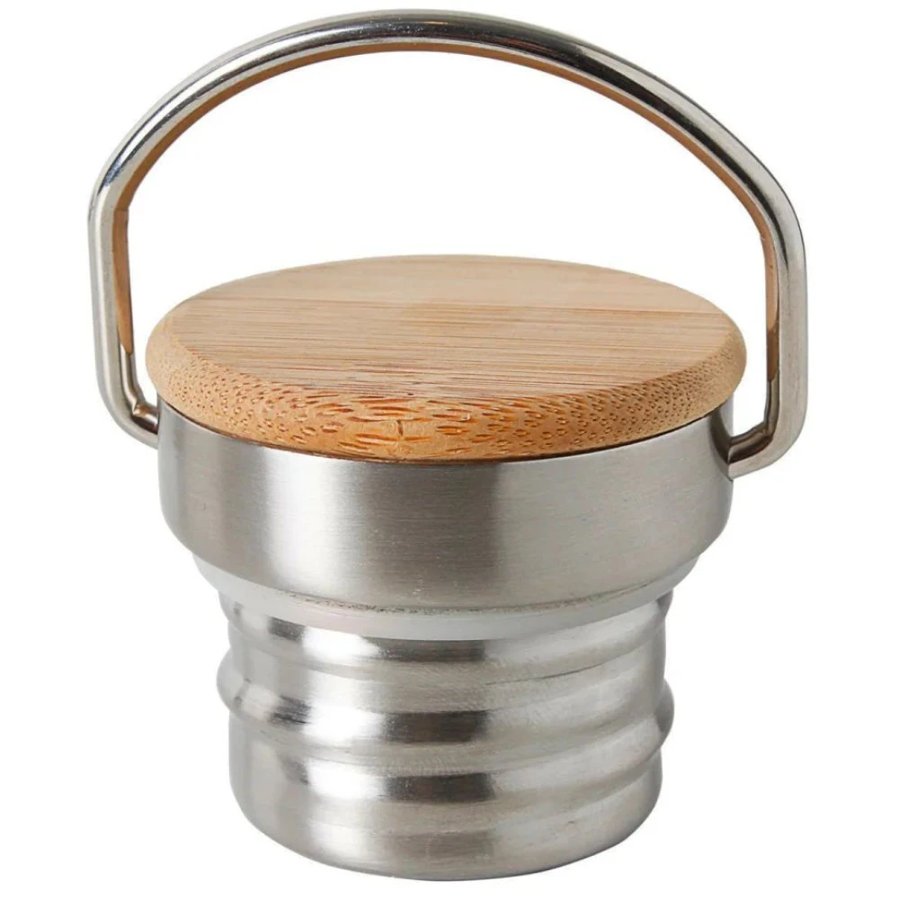 Lebensmittelechte Stahl-Trinkflasche mit Pulverlackierung, Drehverschluss mit Innengewinde und Bambusdeckel. Geruchs- und geschmacksneutral. In der Spülmaschine waschbar.