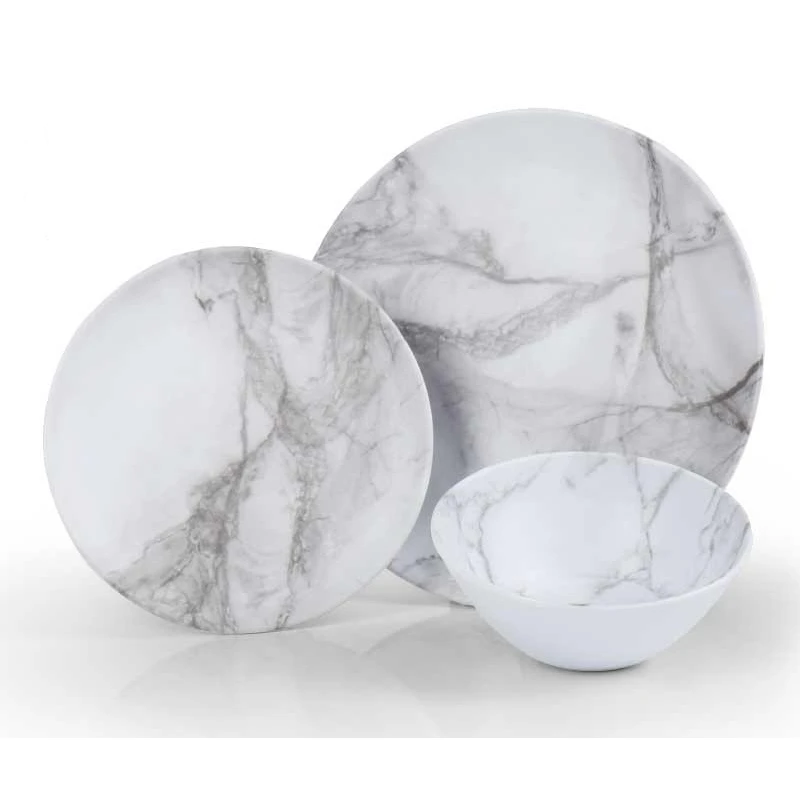 Melamin-Geschirrset für 2 Personen mit edlem Marmor Dekor und mattem Finish.