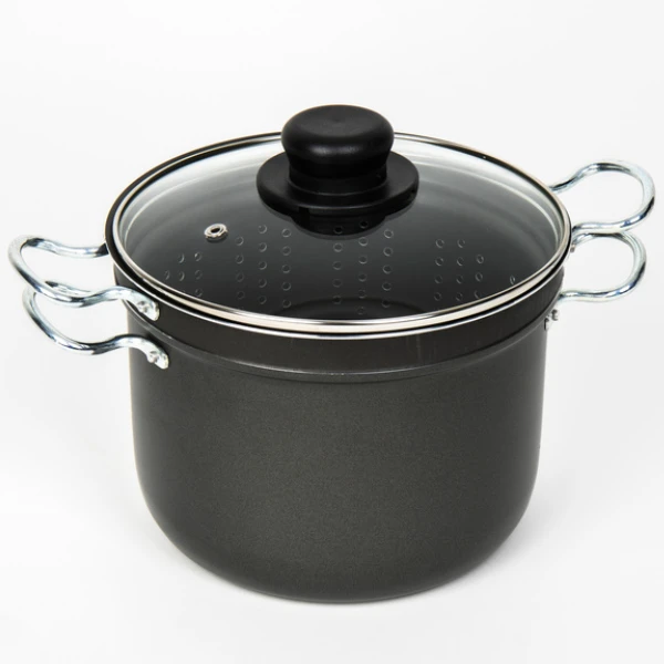 Pastatopf mit Sieb und Glasdeckel. Mit Antihaftbeschichtung. Gas- und Elektroherd geeignet. Ofenfeste Griffe. Spülmaschinenfest.