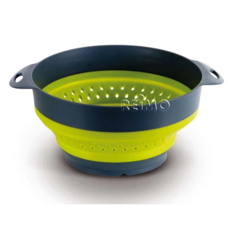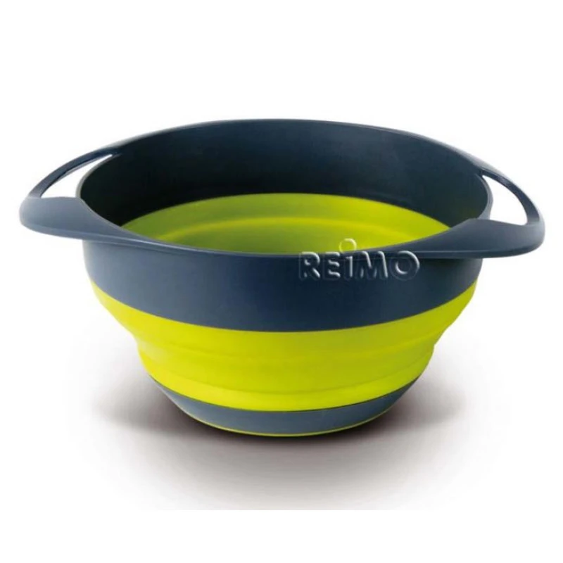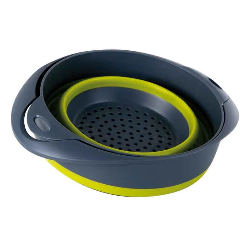 Faltbare Silikon-Schüssel inkl. faltbarem Silikon-Sieb, jeweils mit 2 Haltegriffen. Ineinandergestapelt und zusammengefaltet, kann die Schüssel mit Sieb im Reisemobil oder Caravan platzsparend verstaut werden.