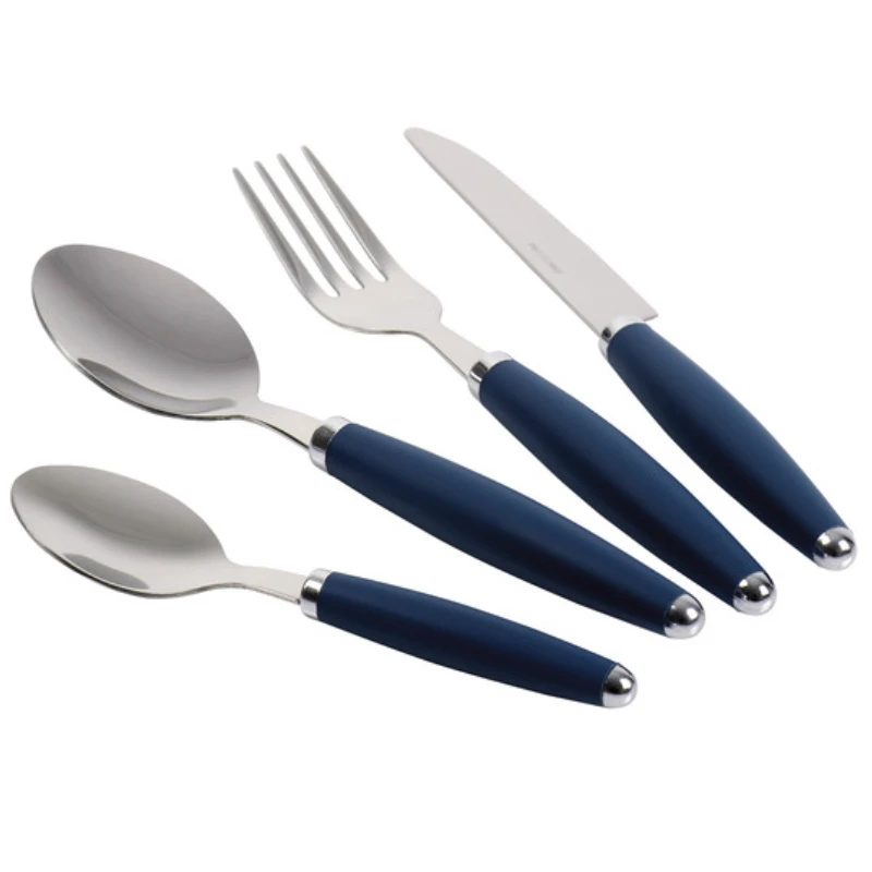 Gefertigt aus hochwertigem Edelstahl 18/10 mit Kunststoffgriff in dunkelblau. Das Besteckset ist spülmaschinengeeignet und lebensmittelecht.