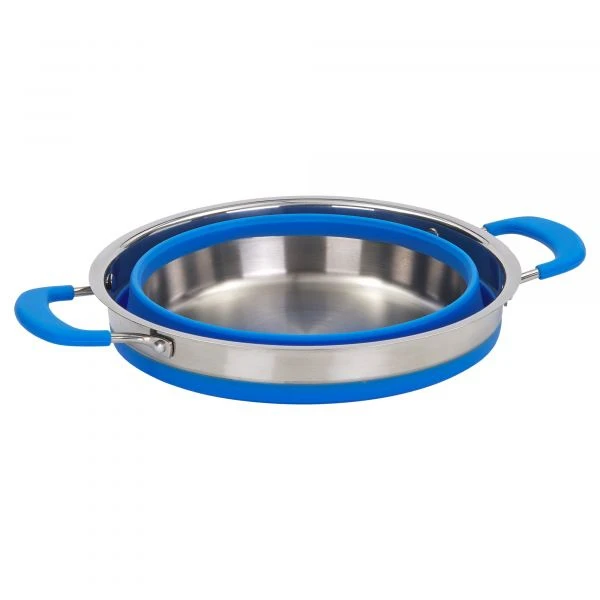 Platzsparender Falttopf aus Edelstahl und Silikon mit Glasdeckel. Für alle Herdarten inklusive Induktion geeignet. Der Kochtopf inklusive Glasdeckel lässt sich nach Gebrauch vollständig zusammenfalten. Sicherheitsdeckel mit Silikonrand (kein Klappern) und Dampföffnung.