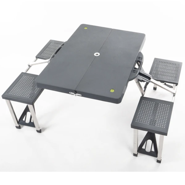 Der Picknickttisch ist blitzschnell aufgebaut und verfügt über 4 fest installierte Sitze, die je bis max. 60 kg belastbar sind. Der Tisch wird in der Mitte zu einem Koffer mit praktischem Tragegriff gefaltet und ist somit einfach zu transportieren.