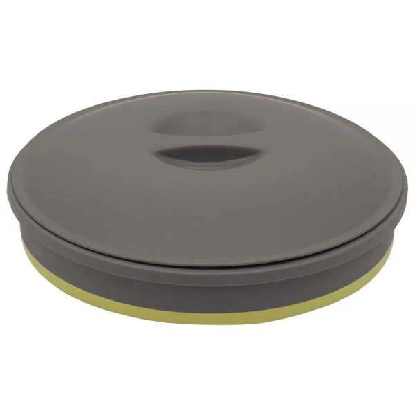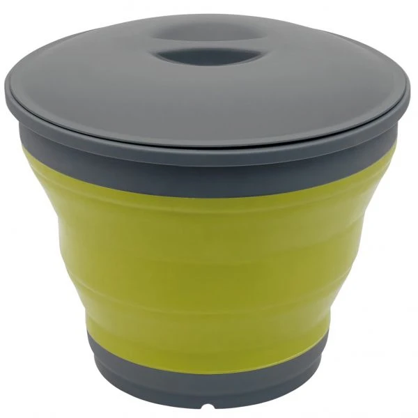 Falteimer mit Deckel und Griff. Kann sehr flach gefaltet werden und hat gefaltet eine Höhe von gerade einmal 5,5 cm.